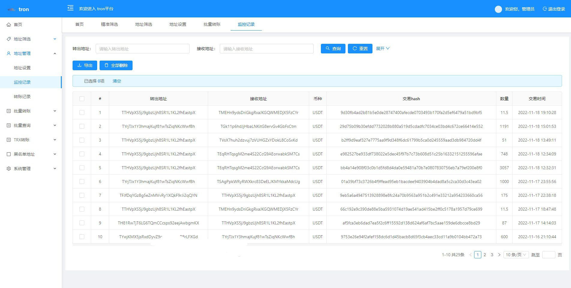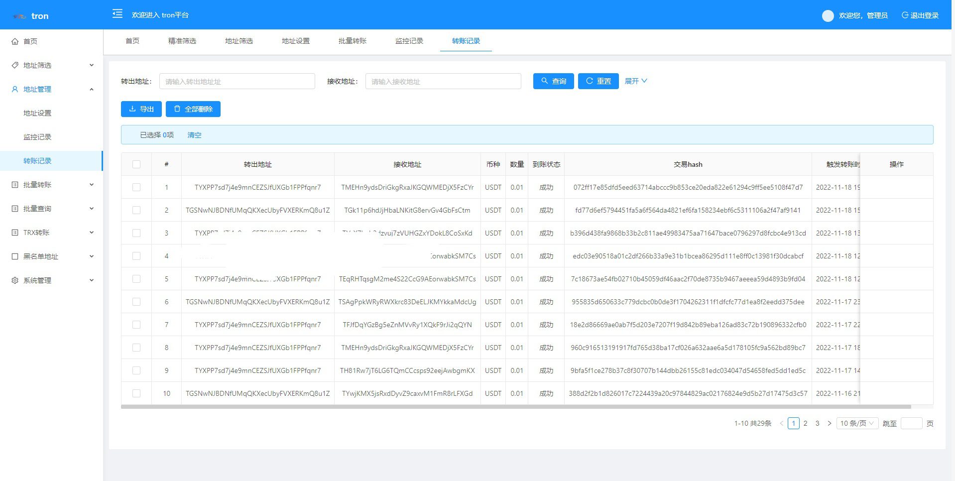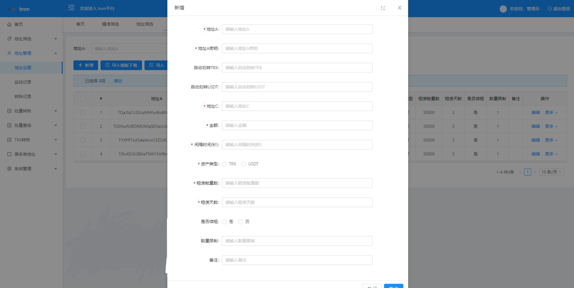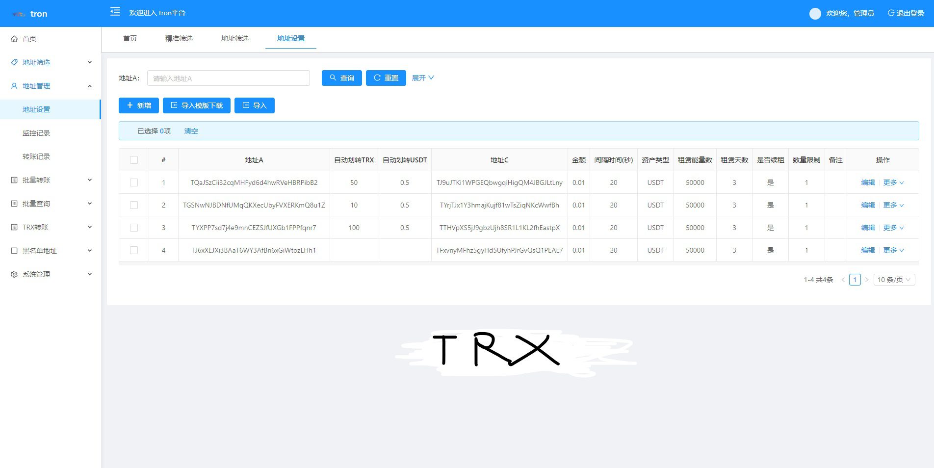 TRX波场/TRX归集/TRX批量广告USDT/批量转账/批量生成地址/钱包/地址余额监控 特色功能 trx地址监控 a地址监控c地址 c地址有交易 a地址会像c地址交易的地址进行返现 返现金额可设置 可监控 c地址转账记录 等等