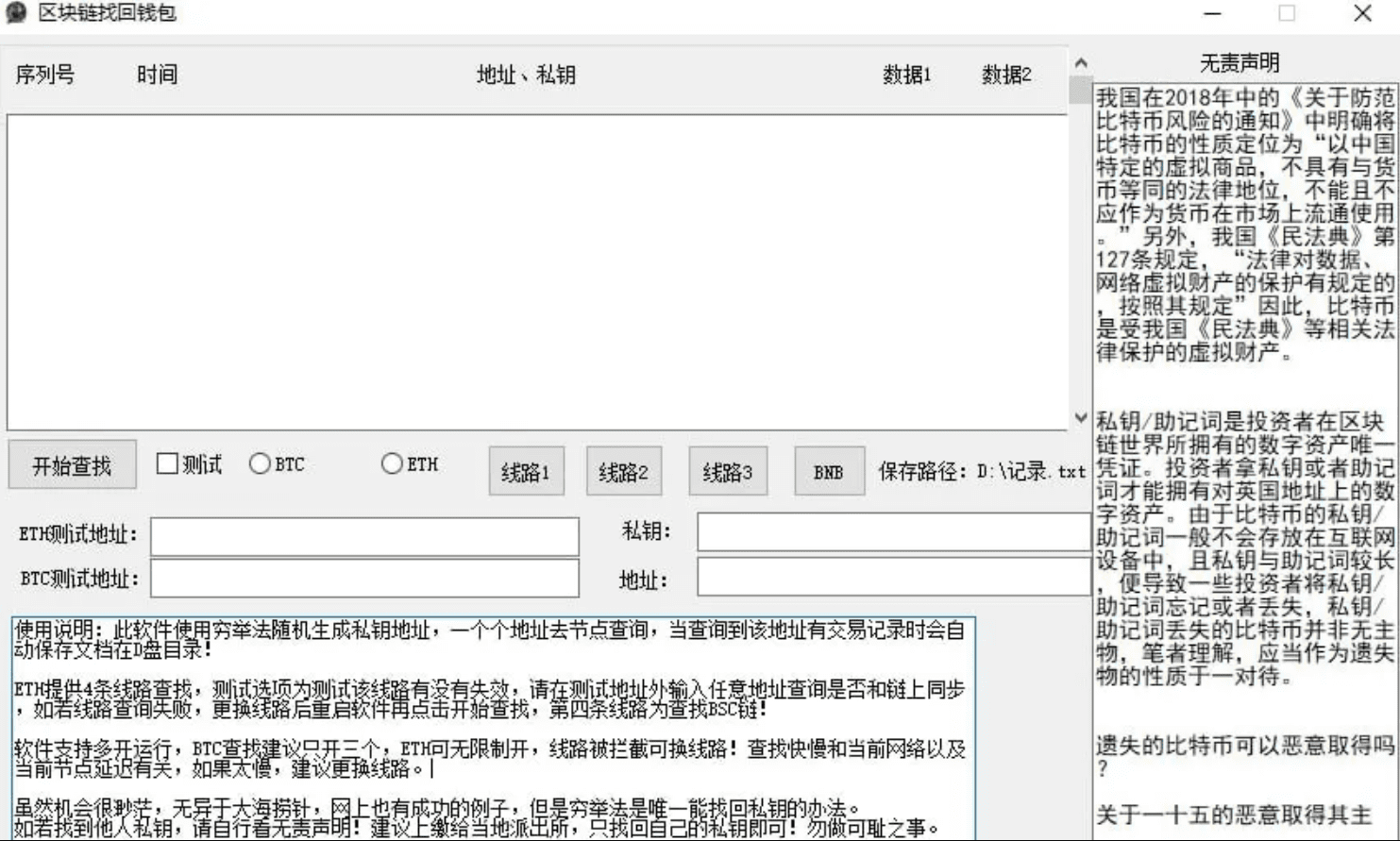 使用说明:此软件使用穷举法随机生成私钥地址,一个个地址去节点查询,当查询到该地址有交易记录时会自动保存文档在D盘目录!
