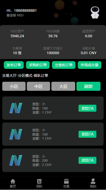 3、交易大厅交易挂单数量为100-200-300-500-600-1000,订单采用排队模式。